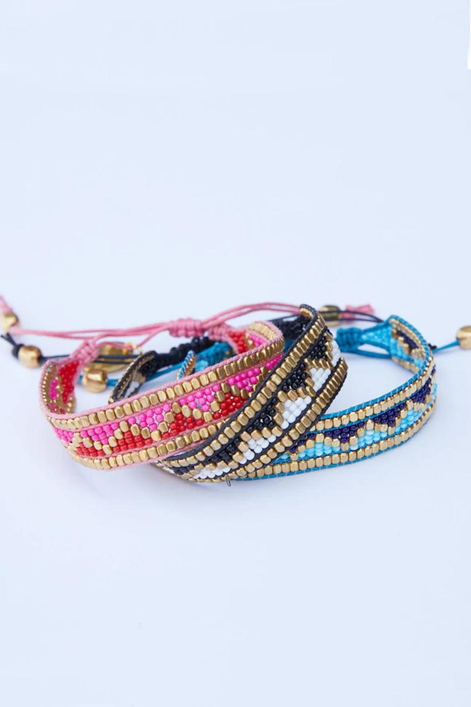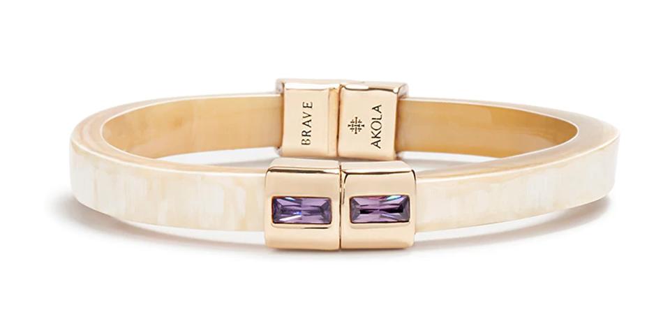 The sustainably made Unlock-It Bracelet from Akola, is handcrafted by Ugandan women artisans. The colored crystals on this hinged bracelet with magnetic clasp represent the connection between the wearer and the maker. Choose from different styes, that match a variety of outfits when traveling, engraved with the words Peace, Grace, Hope, Joy, Brave, Strong, or Glow, $145.
