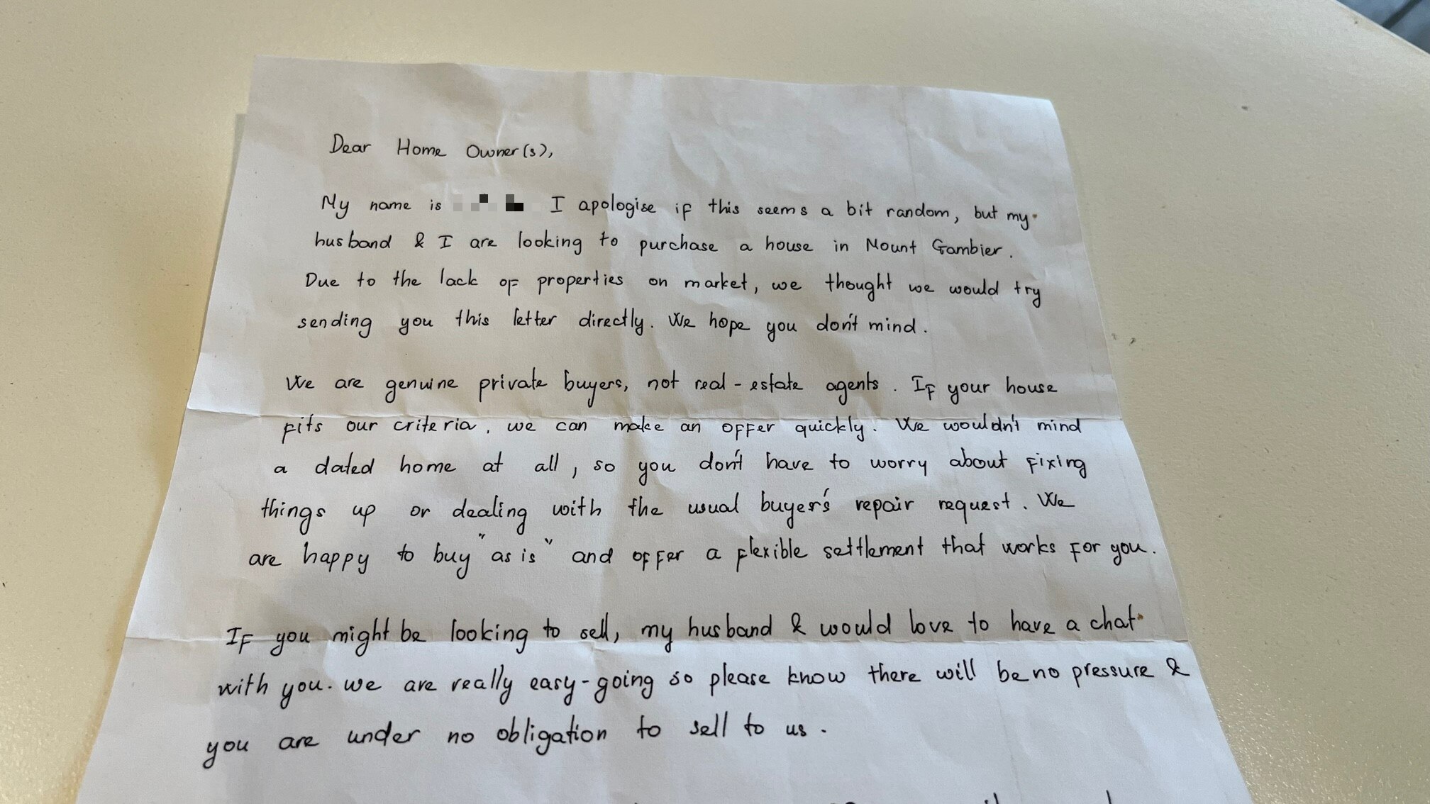 The photocopy of a handwritten letter said that the woman and her husband were looking to buy a house in Mount Gambier and were writing "due to the lack of properties on the market".