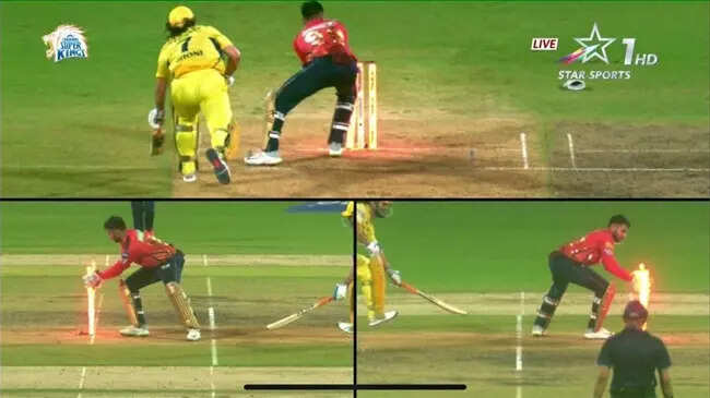 In the last delivery of the CSK innings, Dhoni struck Arshdeep Singh, took a single, and attempted a second run. However, a flat throw from Harshal Patel towards the keeper's end left Dhoni short by a few inches. Wicketkeeper Jitesh Sharma gathered the ball and hit the stumps.