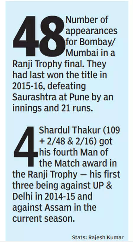 Mumbai, who will take some stopping, are now just a step away from title No 42 and ending their title drought since the 2015-16 season. They will face the winner of the other semifinal between Vidarbha and Madhya Pradesh, in the summit clash of the Ranji Trophy at their traditional bastion — the Wankhede Stadium — from March 10.