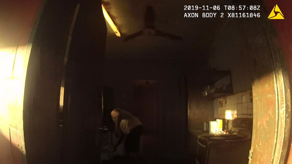 He threatens the officers with the single-handed hatchet, charging past them and sprinting from the house.