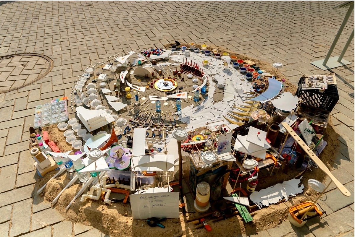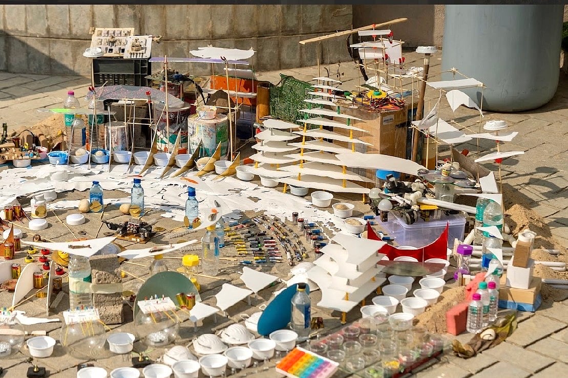 The Jaipur Arts Week (JAW) effectively cashes in on Jaipur’s branding as a creative, cool hub that perfectly brings together the traditional and modern. Run by Sana Rezwan’s Public Arts Trust of India (PATI), it deliberately prioritises public accessibility over commerce. This means its sites and talks are free, the artists are young and emerging, and their audience is strongly local. Children, schools, and craft artisans underpin its inside binding with the city, even as they are thrown together with international/non-Rajasthan young artists chosen through an open call (600 applications for 15 projects) who bring in an outside lens.