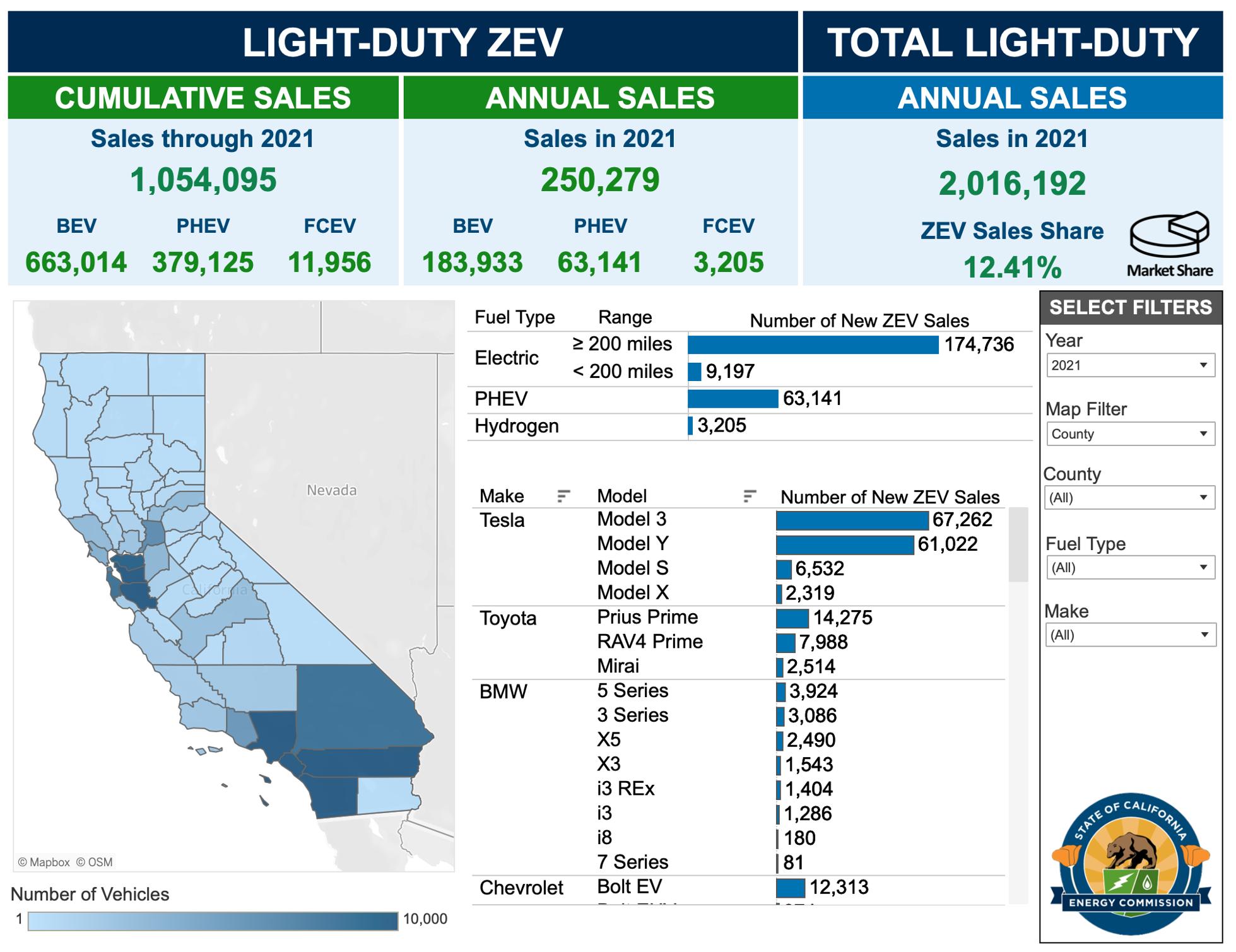 Californians bought 250,279 battery-electric, plug-in hybrid and hydrogen fuel cell vehicles in 2021, including 137,135 Teslas or 55% of the total, according to new data from the California Energy Commission. Tesla’s share of battery-only vehicle sales was a whopping 75%, though down from 79% a year earlier.
