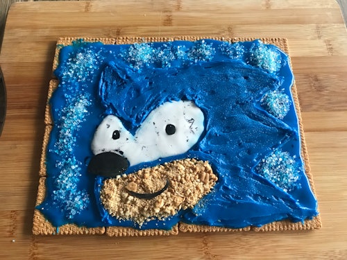 As agonizing as it was to see Sonic look like that, I ended up appreciating the character's appearance. For the longest time, I did not care for Sega's attempts to make Sonic a cultural icon. Past and most recent iterations didn't translate as impressive to me. But while trying to perfect the hedgehog's face on 12 boring biscuits, I felt a slight appreciation (and even new interest) in Sega and Sonic. There's something endearing about the electric-fast runner and how hard Sega has tried to win people over (like I am trying with this sugar cookie). Maybe once I'm done recuperating from what I created (a blue Frankenstein), I'll give Sonic an honest and sincere chance.