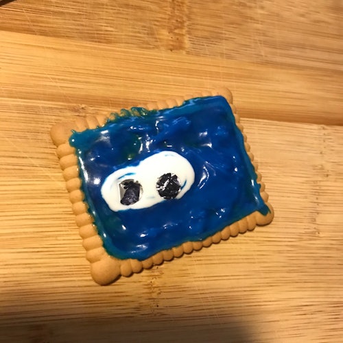 As you can tell, things were not going well. My Sonic the Hedgehog cookie looked like a radioactive zombie begging to be put out of its misery. So I decided to give it another ago. This time, I placed 12 plain Leibniz biscuits down on a wooden board. I then covered the biscuits in a thick and ungodly amount of dark blue icing. I froze the top layer for 30 minutes and then proceeded to sketch Sonic out with a toothpick. Highly advanced techniques, as you can see.