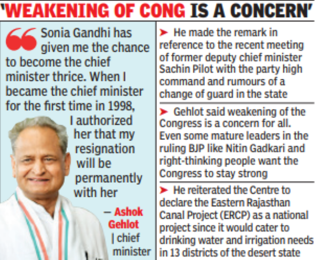 “Sonia Gandhi has given me the chance to become the CM thrice. When I became the CM for the first time in 1998, I told her that my resignation will be permanently with the party high command.” The CM was speaking at the state-level conference of Rajasthan Rajaswa Seva Parishad on Saturday. He was referring to the recent meeting of former deputy CM Sachin Pilot with the party brass and rumours of leadership change in the state. Gehlot said becoming the CM for the third time proved that he is politically strong and not a lightweight.