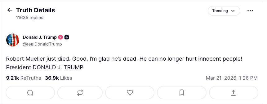 I texted a White House official about whether we could expect a statement from the president. Within minutes, I got a reply pointing me to a Truth Social post containing the president’s reaction: “Good, I’m glad he’s dead.”