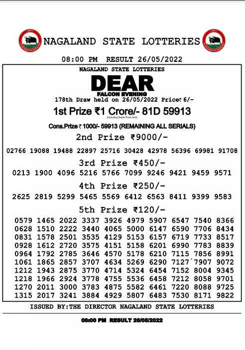Nagaland Lotteries results: Dear Falcon Evening results are below