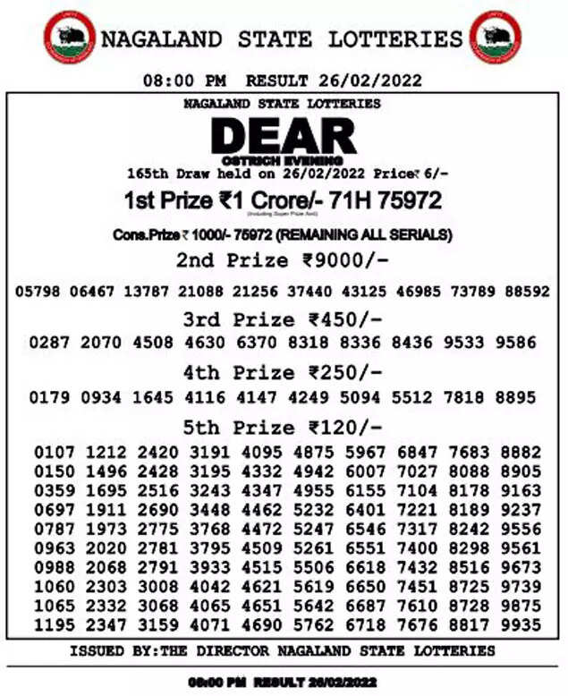 Nagaland Lotteries results: Dear Ostrich Evening results are below