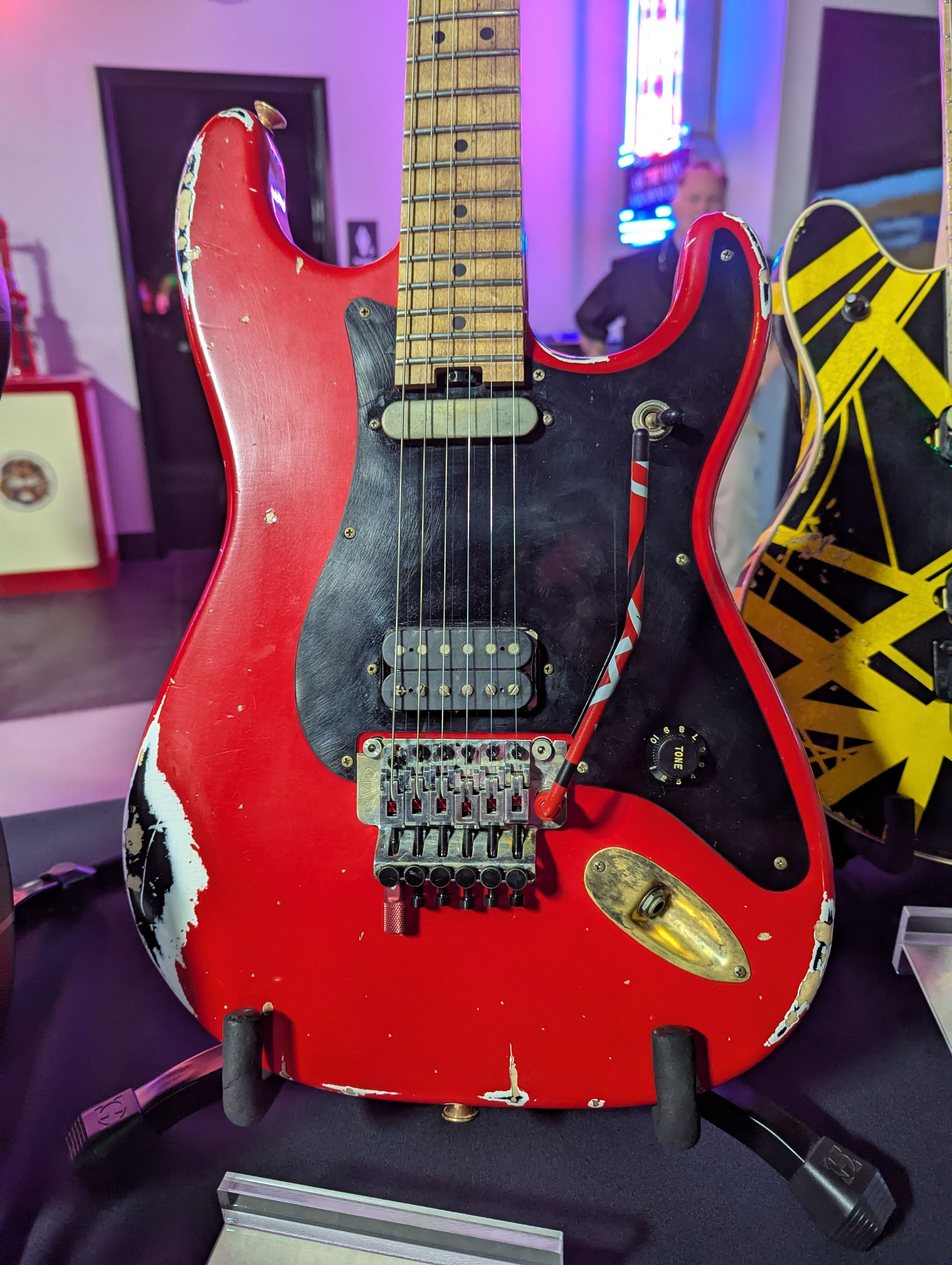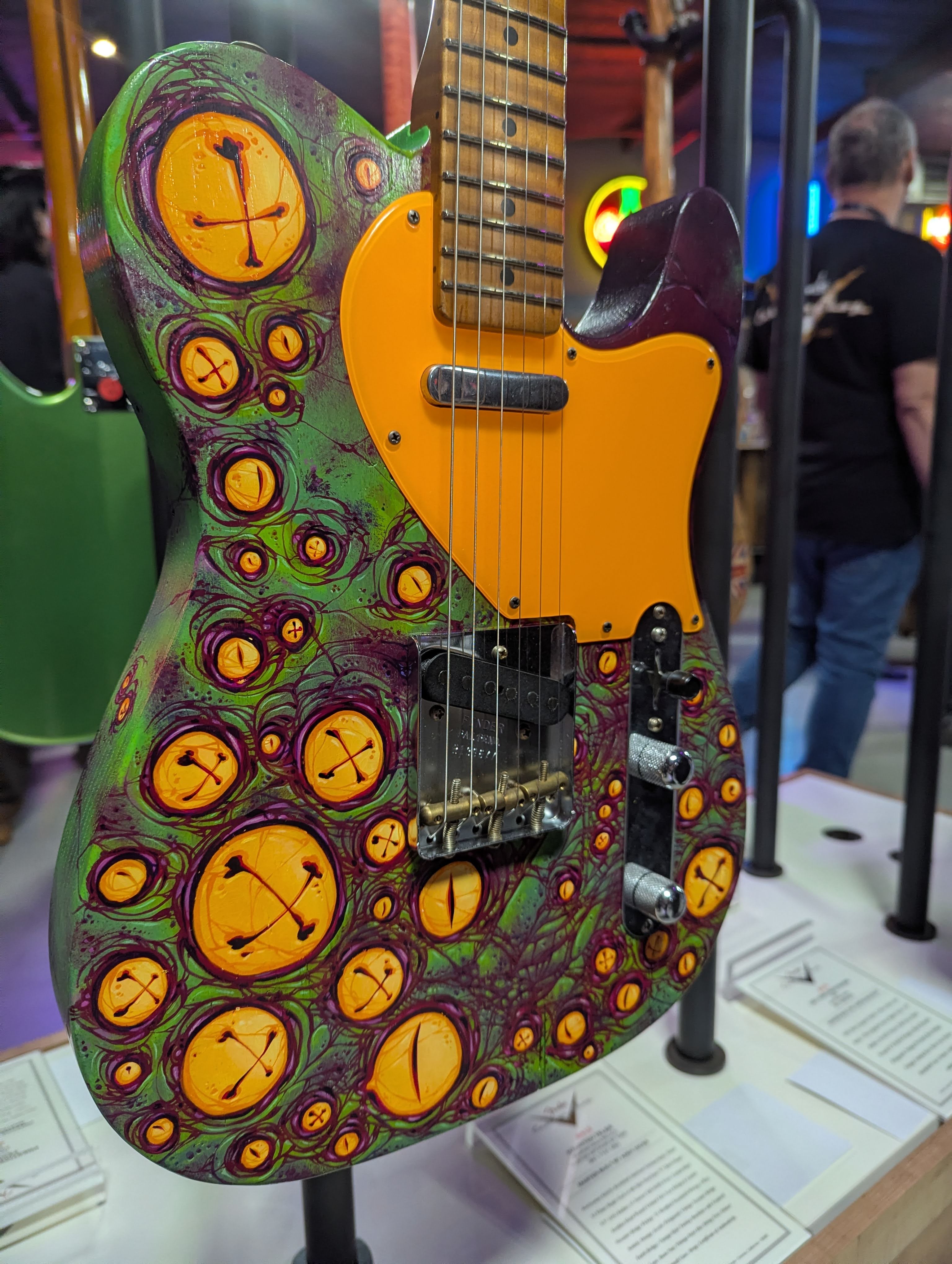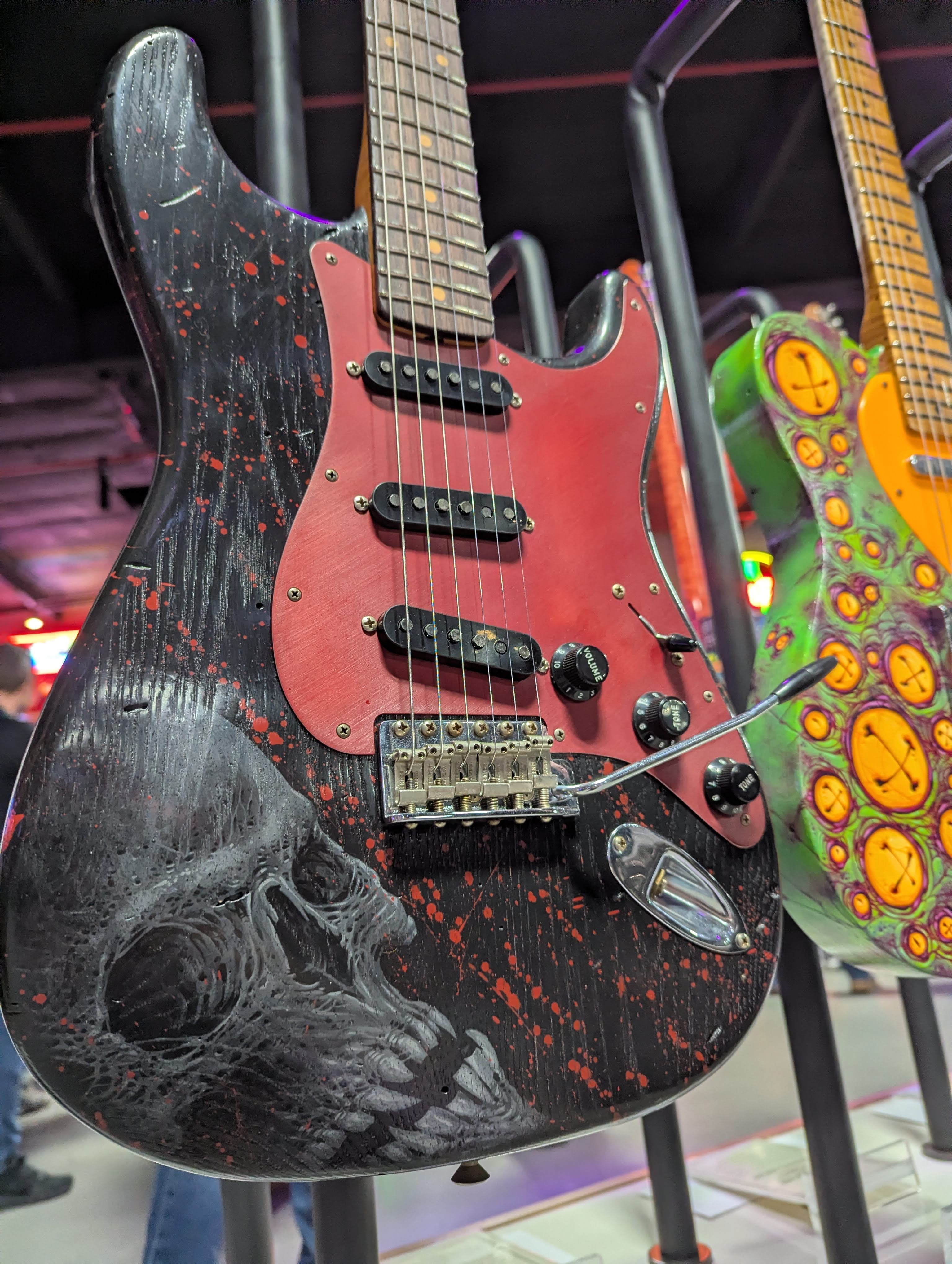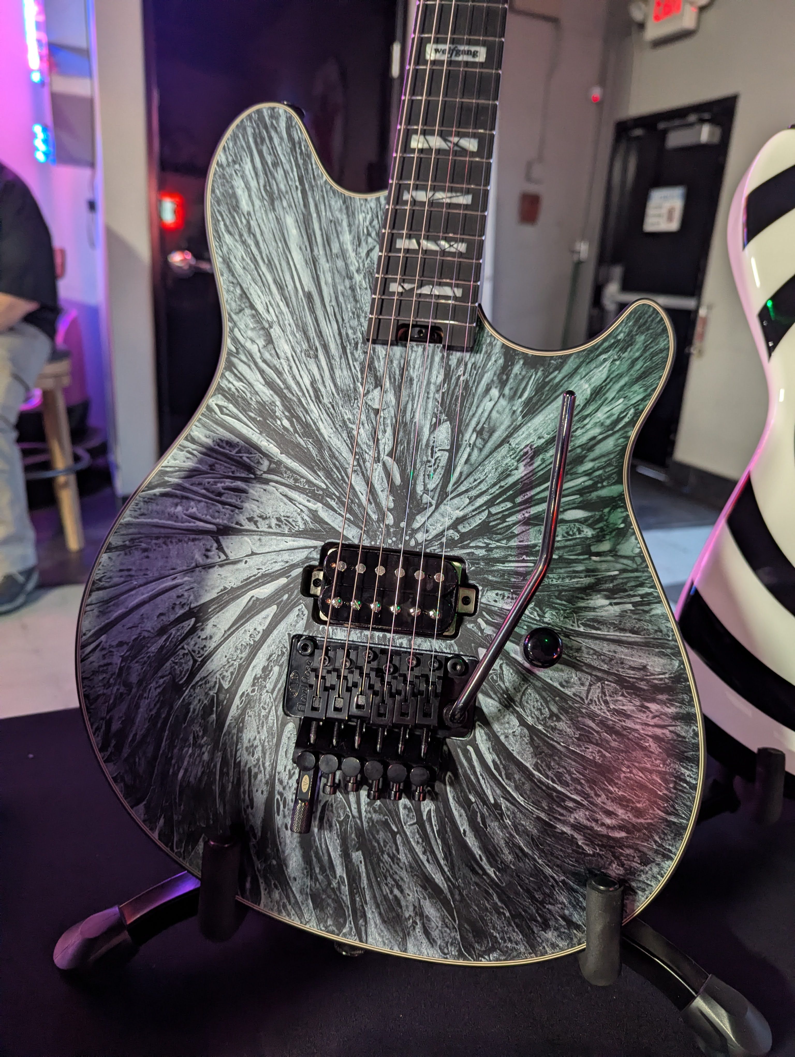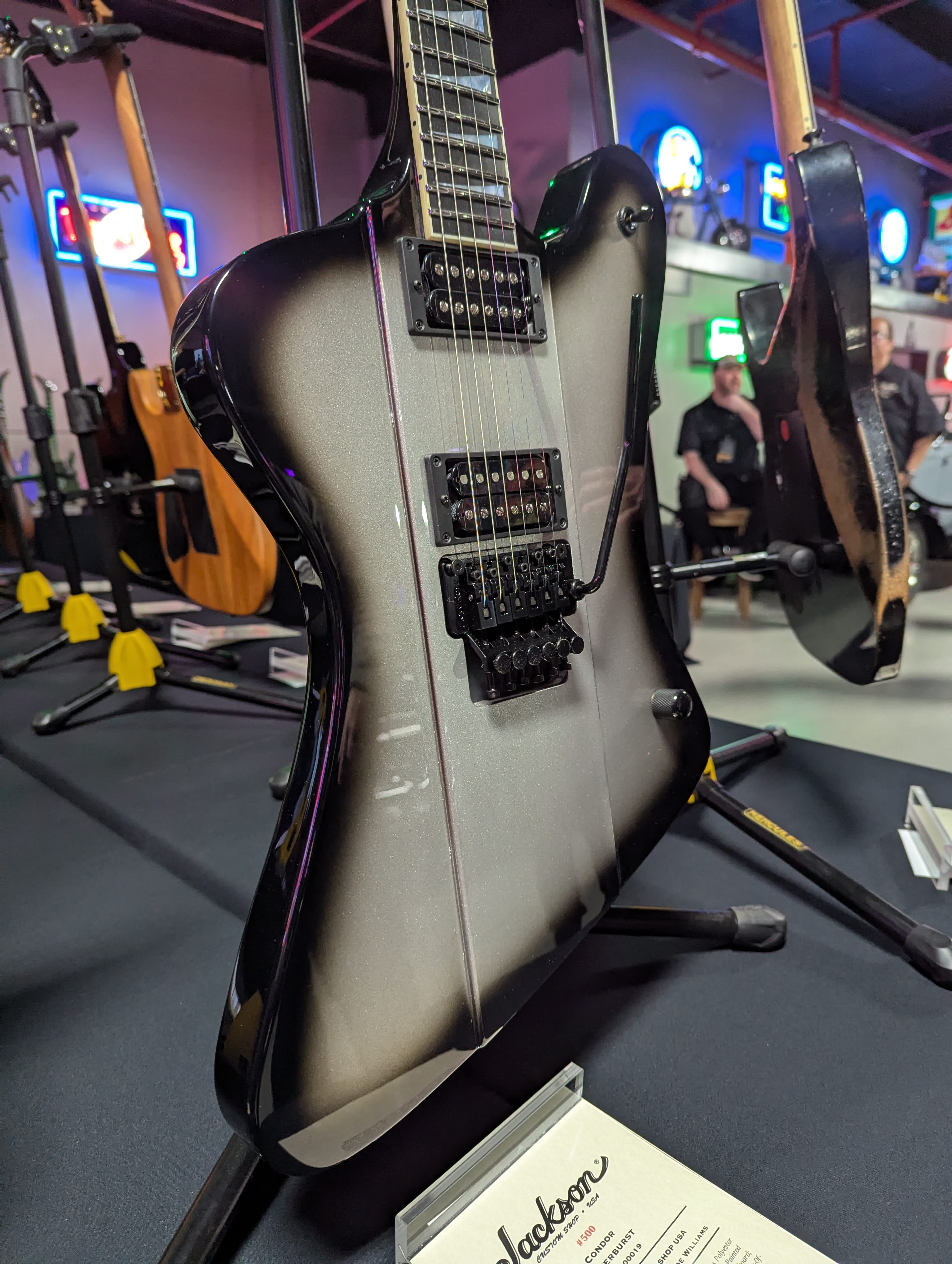 Some extremely cool goings-ons at the EVH and Jackson Custom Shop stalls, too. A striped EVH whammy bar. Silver swirl Wolfgang. The Pile O' Bones Soloist with a constantly flashing red light – and one of the greatest jack socket placements in the history of electric guitars. As for the Jackson Condor (last slide), we're sure we've seen that shape somewhere before…