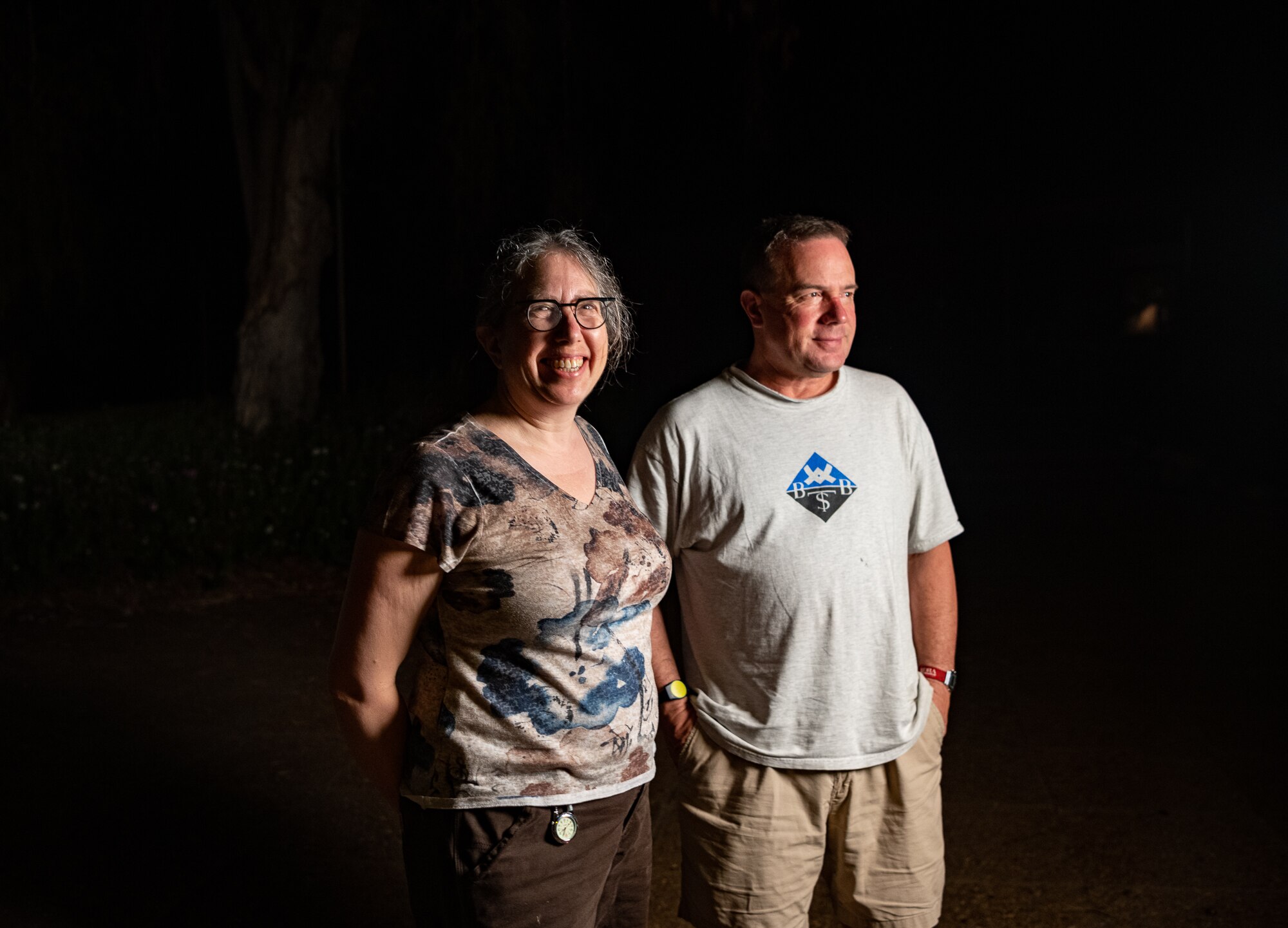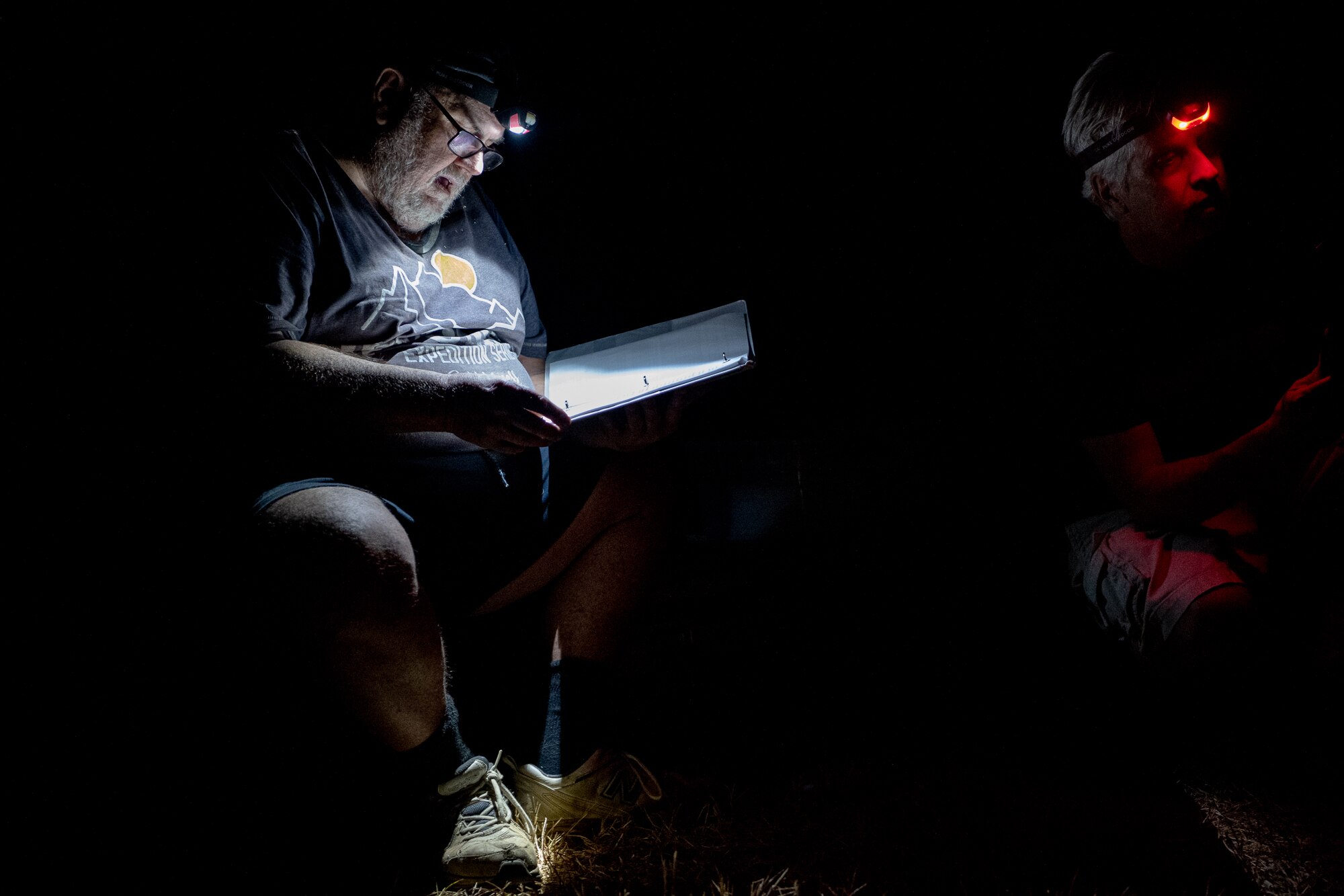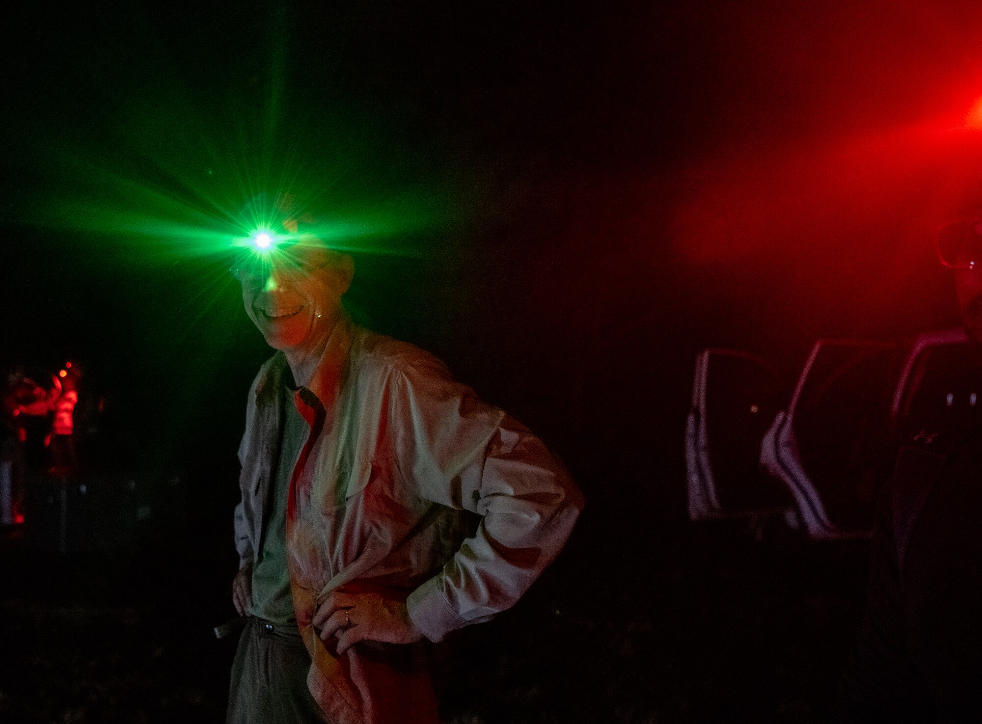 As they finish — and the four-wheel drives lining the paddock cut their engines — the field descends into total darkness. The only lights now are from headlamps and the glow of phones and laptops.