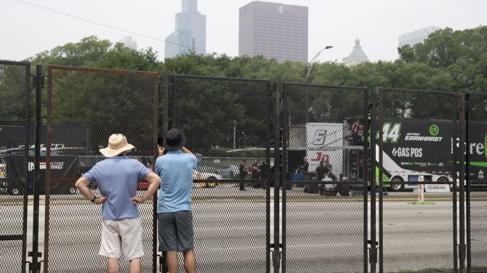 Still, he admired the track through a gap in the fence along Michigan Avenue, explaining to his companions how the drivers and their teams were walking through the course to assess it.