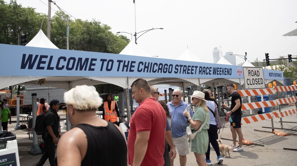 Race crew members could be seen entering their hotels along Michigan Avenue. A vendor sold NASCAR-branded T-shirts at a street corner. Crews unloaded their cars from trailers along DuSable Lake Shore Drive. Stacks of yet-to-be-built fences lay along the track.