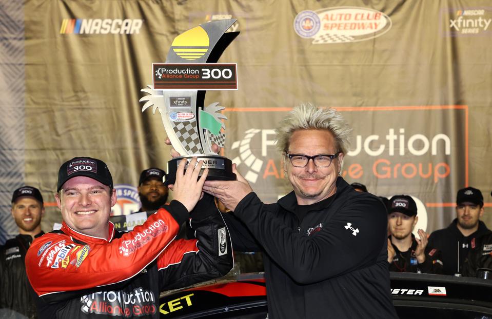 FONTANA, CALIFORNIA - FEBRUARY 26: Cole Custer, driver of the #07 Production Alliance Group Ford, is presented the Production Alliance 300 trophy by Dale Sahlin, Founder and Owner of Production Alliance Race Group in the Ruoff Mortgage victory lane after winning the NASCAR Xfinity Series Production Alliance 300 at Auto Club Speedway on February 26, 2022 in Fontana, California. (Photo by James Gilbert/Getty Images) Getty Images