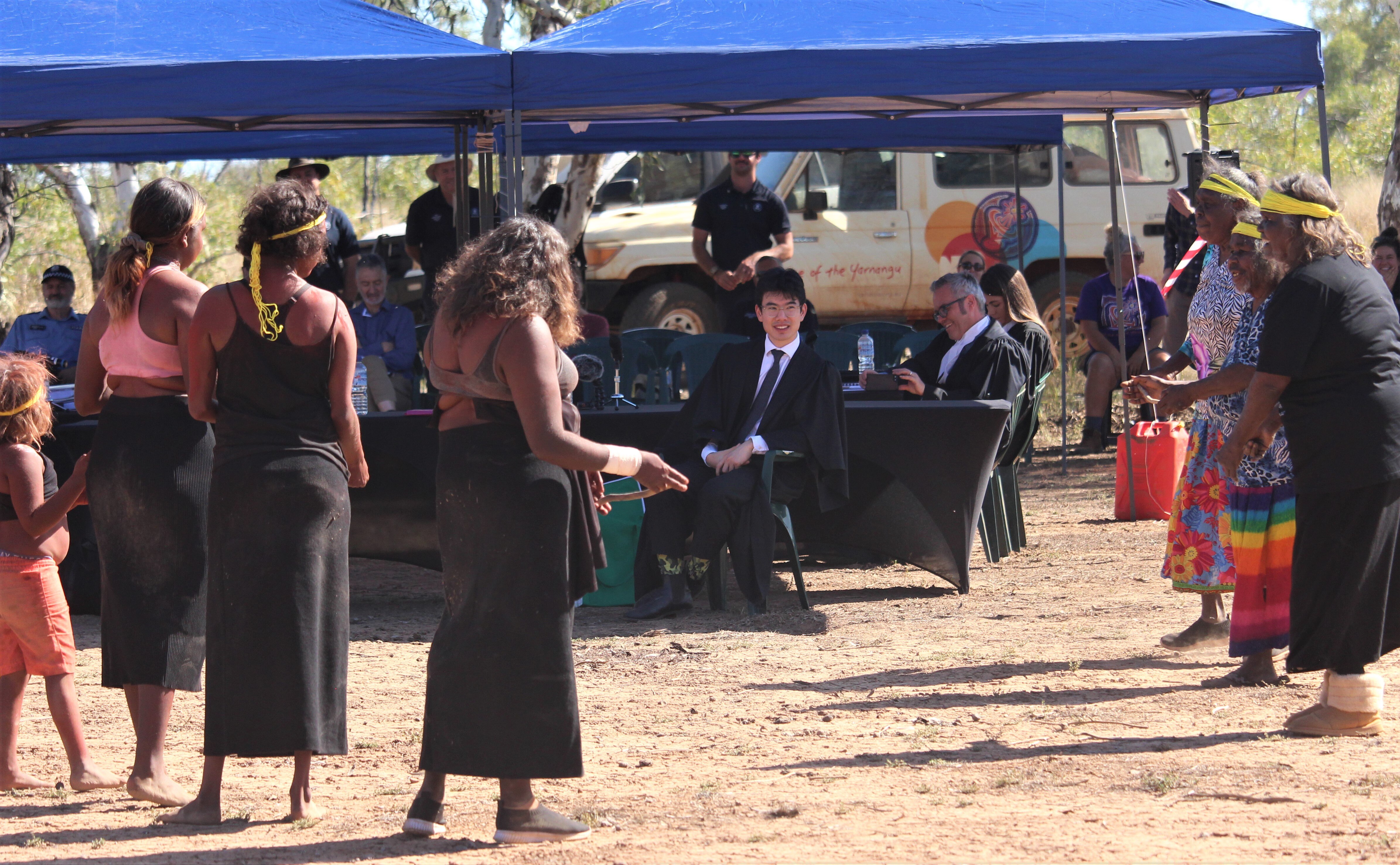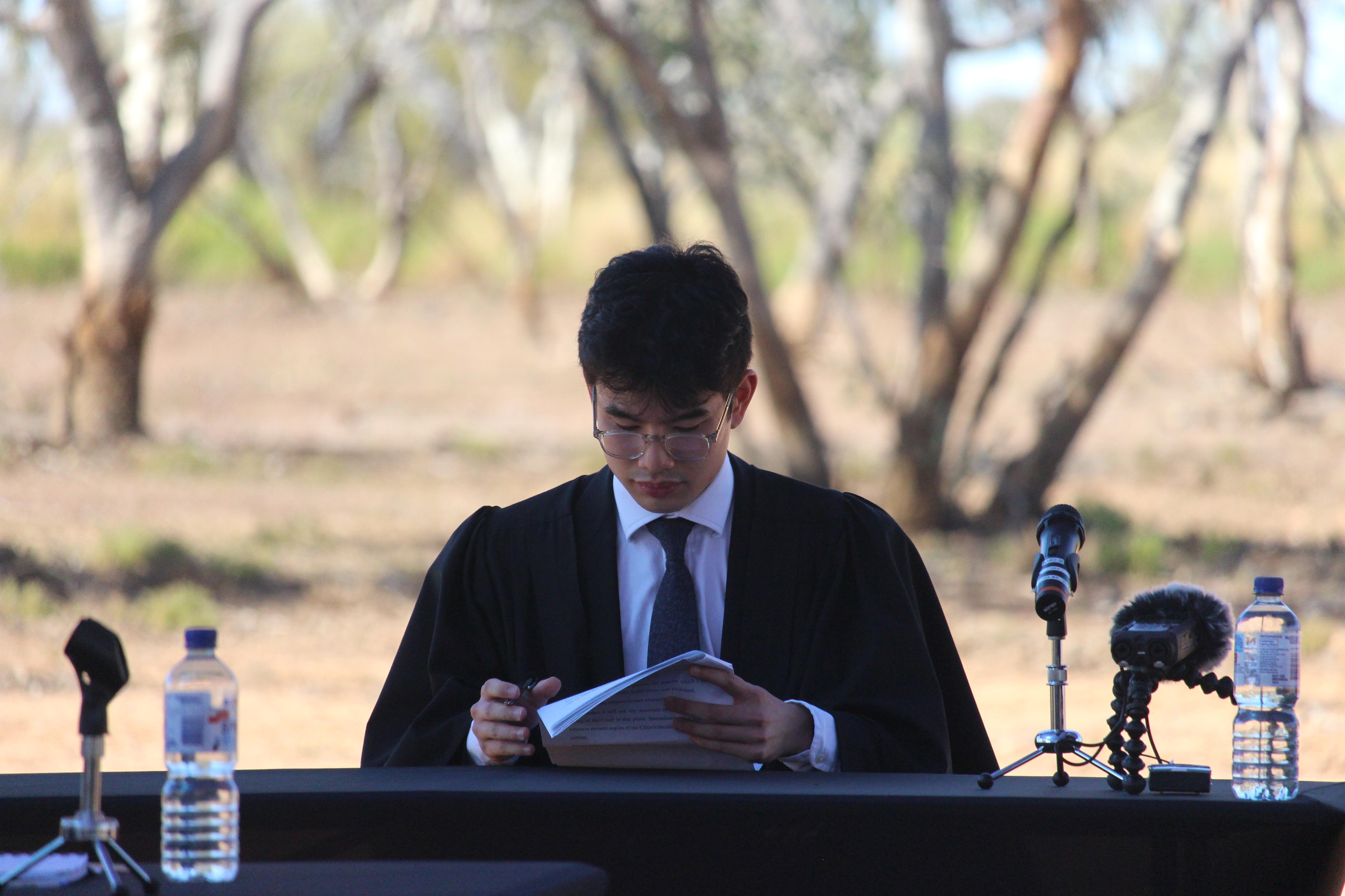 From a table on a lake bed, cracked and dry from the Gibson Desert sun, judge's associate Jared Hee delivers the speech Ms Ward fought 20 years to hear.