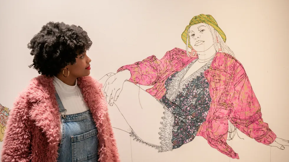 Gio Swaby, who’s from the Bahamas, creates art from her home studio in Toronto. She will present a series called “Seeing You Through Her and Me.” Swaby used textiles to sew self-portraits of three Black women, all close friends.