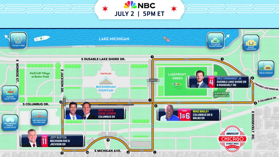 And that’s how NBC will broadcast the NASCAR Chicago Street Race this weekend. Following its blueprint from Watkins Glen, a road course, NBC will position commentators in four spots on the city streets, in addition to the pit reporters and studio crew, which will broadcast at Buckingham Fountain. The Loop 121 Xfinity race airs at 4 p.m. Saturday on USA and the Grant Park 220 Cup race at 4:30 p.m. Sunday on NBC and Peacock.