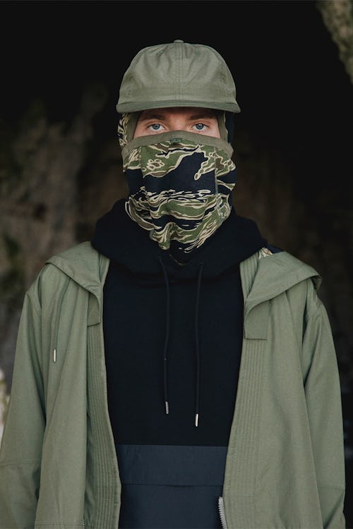 Accessories include a 6-panel cap, bucket hat, and a balaclava-like face mask made from a blend of hemp and organic cotton. Elsewhere, a twill face mask hat takes face coverings to a new level. Inspired by cold-weather-protecting U.S. Army headgear, the piece can be worn to completely conceal the face — the mouth and nose are reflective if you do so — or as a traditional hat.