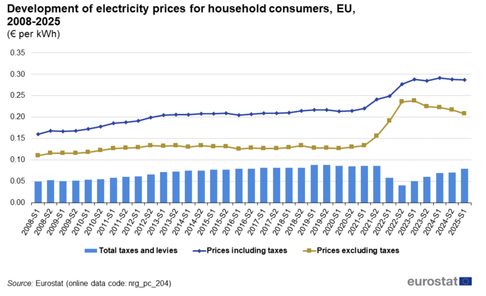 In fact, electricity prices for households in the European Union during the first half of the year were down 1.5% from the first half of 2024, according to data published in October. Excluding taxes Europeans paid, electricity prices fell more sharply and have been sliding since 2023, after spiking in 2021 and 2022.