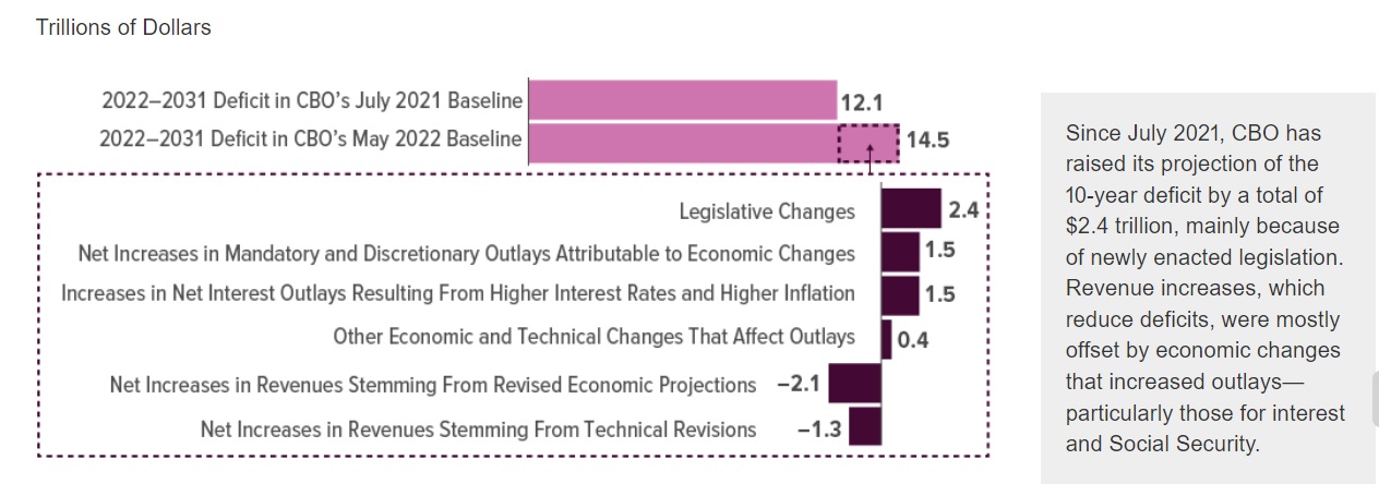 "Since July 2021, CBO has raised its projection of the 10-year deficit by a total of $2.4 trillion, mainly because of newly enacted legislation," the report reads. "Revenue increases, which reduce deficits, were mostly offset by economic changes that increased outlays—particularly those for interest and Social Security."