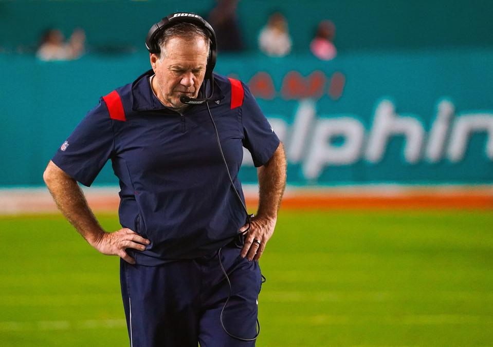 Miami Gardens, FL - January 9: New England Patriots head coach Bill Belichick on the sidelines during the third quarter. The Miami Dolphins host the New England Patriots in a NFL game on January 9, 2022 at Hard Rock Stadium in Miami Gardens, FL. (Photo by Barry Chin/The Boston Globe via Getty Images) Boston Globe via Getty Images