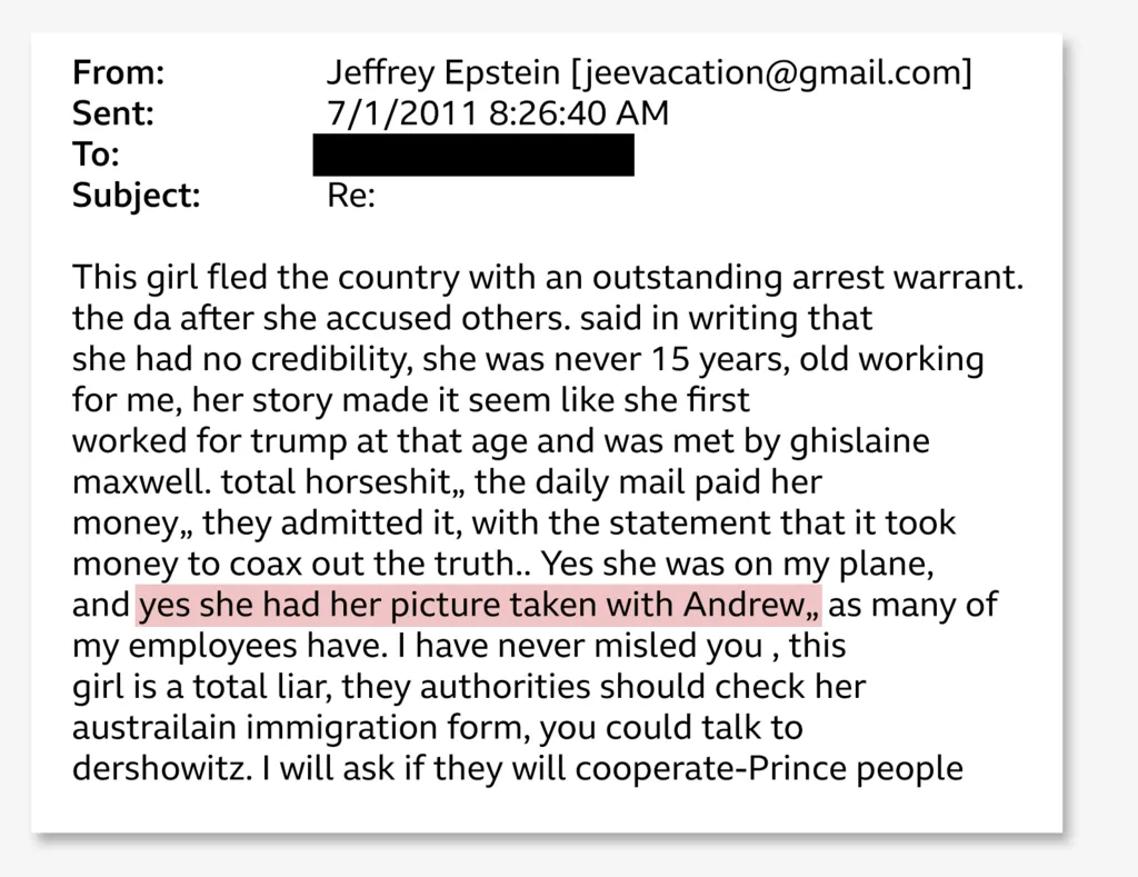 For years Andrew has insisted he cut ties with Epstein in 2010. The emails paint a different picture. Epstein even confirmed to a journalist that Andrew had posed for a photo with accuser Virginia Giuffre, saying, “Yes she (Virginia) was on my plane, and yes she had her picture taken with Andrew, as many of my employees have.”