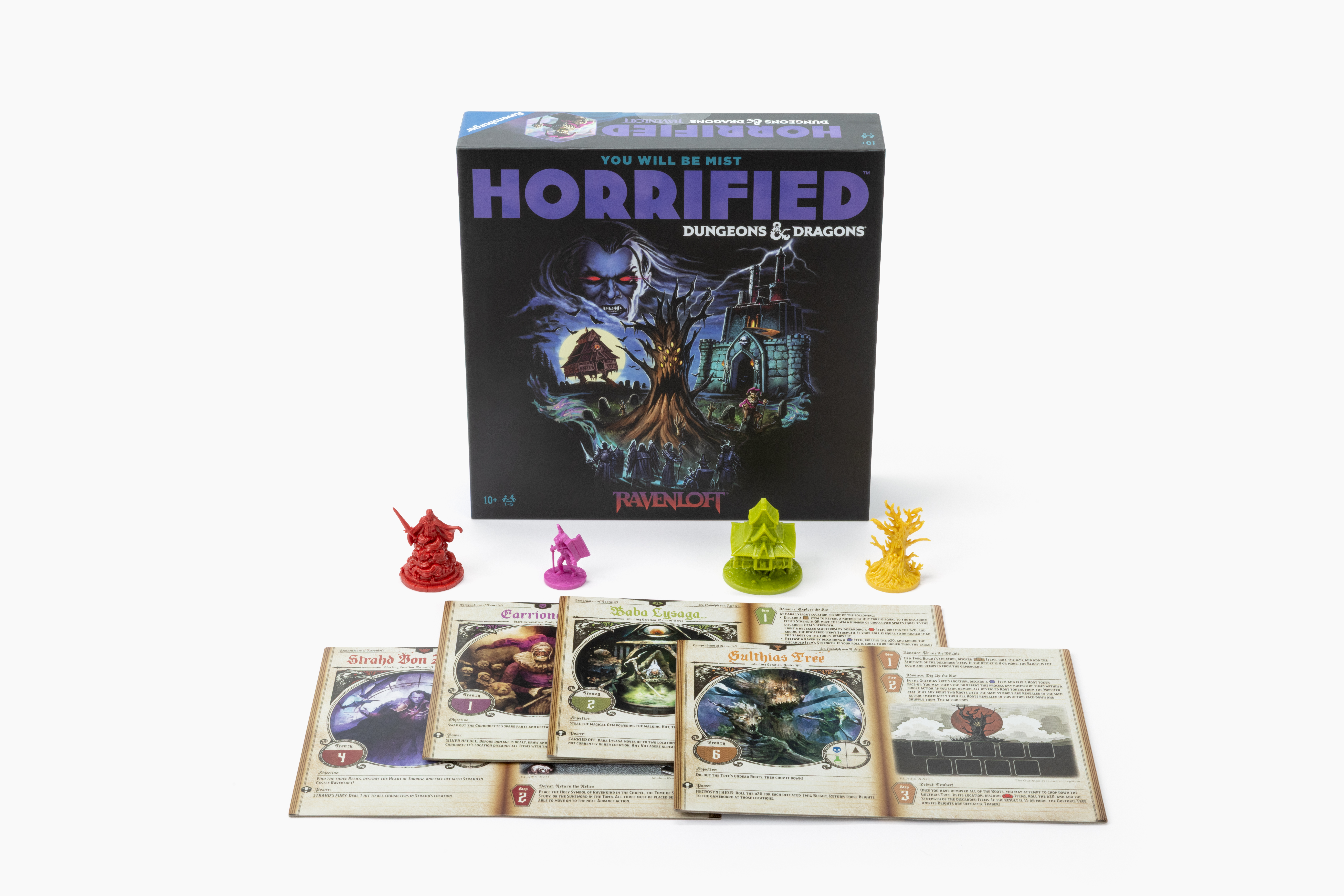 In Horrified, players roam across the board, collecting items used to defeat various monsters. In Horrified: Dungeons & Dragons – Ravenloft, players will challenge up to four new monsters: Ravenloft’s most dangerous Darklord, Strahd, the murderous living doll Carrionette, the witch Baba Lysaga and her walking hut, and the sentient, supernatural Gulthias Tree. Each monster has different conditions needed to defeat it and can fell innocent bystanders with a single attack. Players will have to protect bystanders and guide them across the board, while simultaneously avoiding the monsters and collecting items along the way.