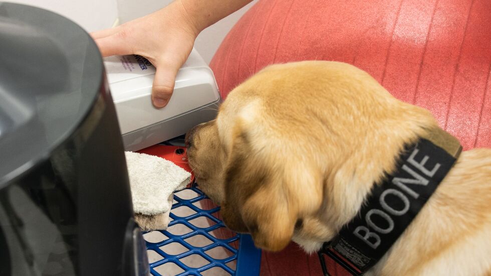 In one of the first searches, Boone let out a puff near a television stand, according to Codd. The puff is one of his signals that he smells something. And then he stares at Codd and remains still, a behavior that tells Codd an electronic device is near. He does this whenever he picks up the scent of triphenylphosphine oxide, a chemical that prevents devices from overheating.