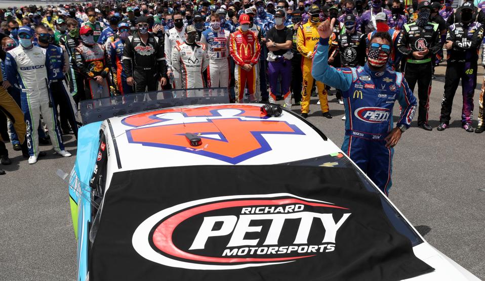 TALLADEGA, ALABAMA - JUNE 22: NASCAR drivers stand in solidarity with Bubba Wallace, driver of the #43 Victory Junction Chevrolet, during pre-race ceremonies prior to the NASCAR Cup Series GEICO 500 at Talladega Superspeedway on June 22, 2020 in Talladega, Alabama. A noose was found in the garage stall of NASCAR driver Bubba Wallace at Talladega Superspeedway a week after the organization banned the Confederate flag at its facilities. (Photo by Chris Graythen/Getty Images) Getty Images