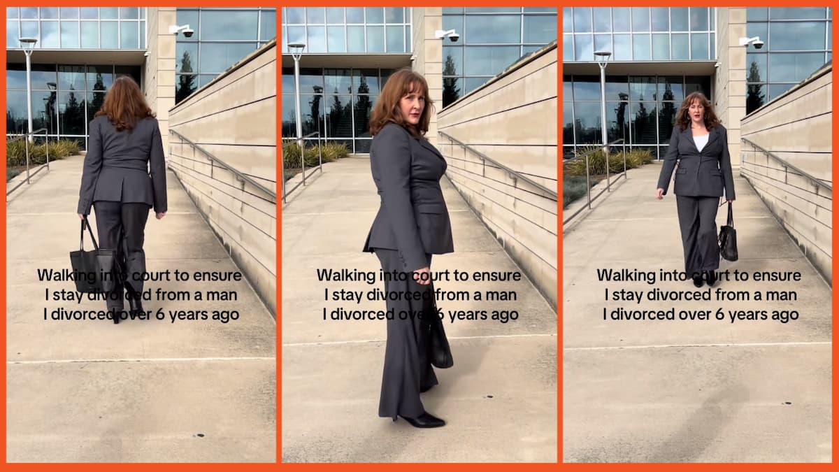The short clip was posted to TikTok by Katherine Jacobs and she’s dressed to kill as she struts outside the courthouse to the song “Girl, so confusing” by Charli XCX. The caption reads, “Walking into court to ensure I stay divorced from a man I divorced over six years ago.”