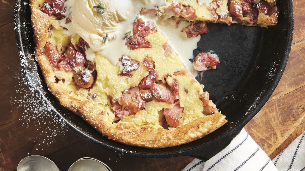 Titanic crew members were served stewed rhubarb and custard on April 14. Crew member Edward Wheelton saved a menu, which was written by hand, from the crew lunch during the Titanic’s sea trials on April 3. Rhubarb tart was listed on the menu. In England, stewed rhubarb and cream — sometimes called a “rhubarb fool”— is a treat that is as traditional as scones and clotted cream. In this recipe, stewed rhubarb is the main ingredient in a Dutch baby dessert. A Dutch baby dessert is similar to a sweetened version of a Yorkshire pudding or a popover. A hint of lavender adds flavor.