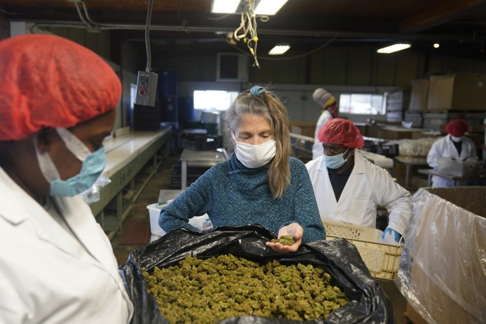 Gail Hepworth, center, co-owner with her sister of Hepworth Farms in Milton, N.Y., talks with employees as dried hemp is processed, Monday, April 12, 2021. Farmers dealing with depressed prices for plants that produce CBD extract are eager to take part in a statewide marijuana market expected to generate billions of dollars a year once retail sales start. They already know how to grow and process cannabis plants, since hemp is essentially the same plant with lower levels of THC, marijuana's active ingredient. Now they're waiting on rules that will allow them to switch seeds. (AP Photo/Seth Wenig) ASSOCIATED PRESS