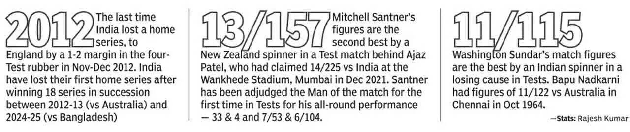 The second Test in Pune was even more dramatic. New Zealand fought back after being bowled out for 259, with Mitchell Santner delivering a match-winning performance, taking 7 for 53 to dismiss India for just 156. New Zealand set India a challenging fourth-innings target of 359, and despite Yashasvi Jaiswal's blistering 77, India folded for 245, giving New Zealand a 113-run victory and their first-ever Test series win in India. This also ended India's 12-year unbeaten run in home series.