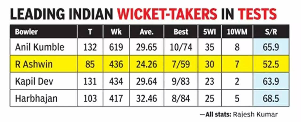 Ashwin went past Kapil Dev's tally of 434 Test wickets on Sunday and has 648 international wickets across three formats. Warne had 1001 international wickets in two formats while Muttiah Muralitharan has 1347 wickets across three formats and Anil Kumble has 956 international wickets. Pacers Glenn McGrath, James Anderson and Wasim Akram are the only other bowlers to have taken over 900 international wickets.