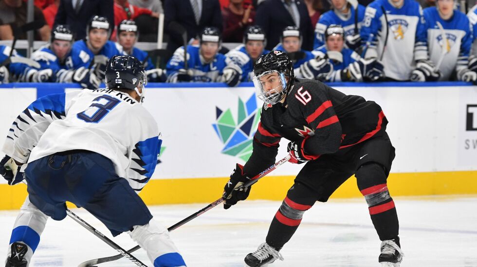 Connor Bedard #16 of Canada skates during the game against Finland in the IIHF World Junior Championship on August 20, 2022 at Rogers Place in Edmonton, Alberta, Canada (Andy Devlin/ Getty Images)