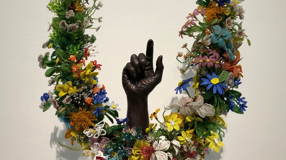 The show presents a series of dramatic Cave bronzes, juxtaposing body parts with found objects. Look at this opened hand surrounded by a U of vintage beaded flowers. You instantly see that the hand is positioned as if holding a gun, except the gun isn’t there. The payoff is the title of the 2016 work, “Unarmed.” Not only beautiful, but with a clear message. It’s a piece of art you can talk about, and should.