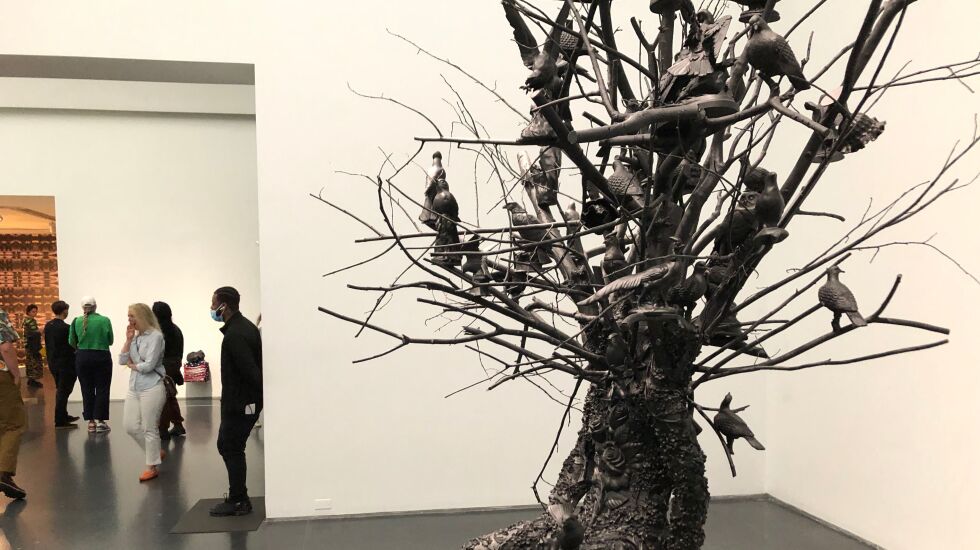 Look at “Untitled,” his 2018 work, a few dozen wooden souvenir heads of Black people, set on a table. Add an American eagle that looks like it’s deciding which eye to pluck out next, and suddenly you’ve got something meaningful.
