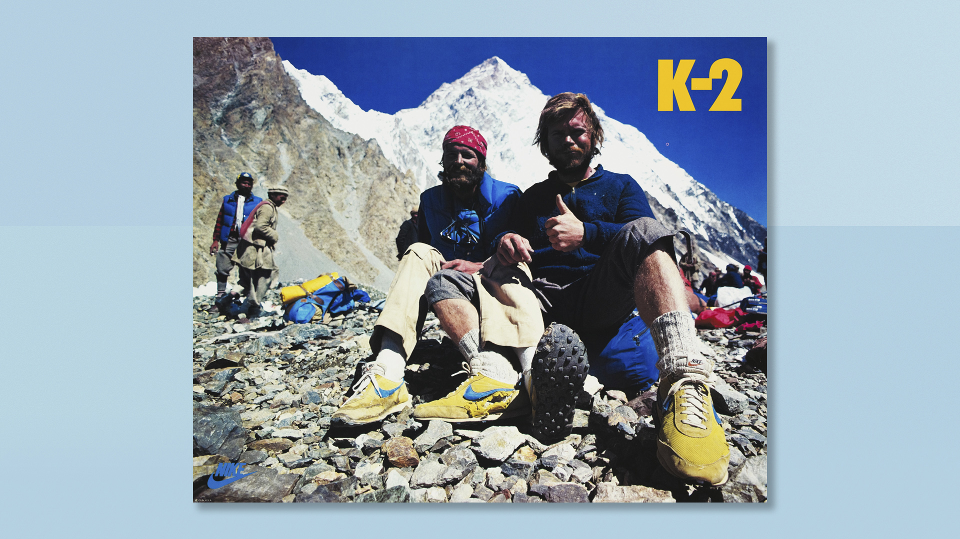 Over time, the model became associated with a story that the brand has continued to reference, hinged on an iconic photo of American mountaineers Rick Ridgeway and John Roskelley wearing the shoes during an expedition on K2.