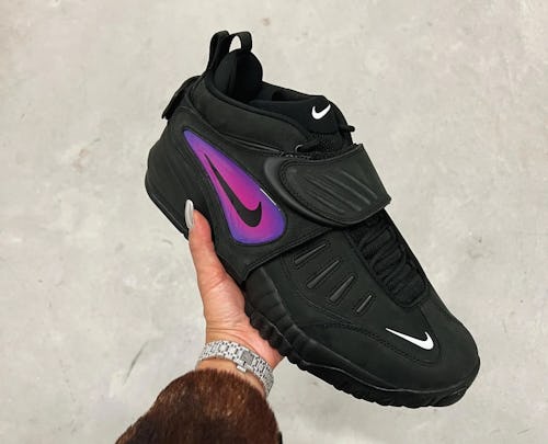 Crafted from black nubuck, the sneaker bears white Swooshes at its sides, toes, and tongues, with no Ambush branding visible (so far). A removable Velcro overlay — sans its original “NIKE” branding — wraps around the shoe’s center, covering its laces and switching out the lateral Swoosh for a black Swoosh housed in a gradient pink and purple bubble. Like most of Ahn’s designs, the sneaker offers a range of styling options, and we wouldn’t be surprised if Ambush offered a variety of wrap choices to pick from.