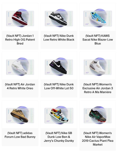 StockX’s initial lineup of NFTs consisted of nine virtual sneakers, eight of which were made by Nike, tied to real-life shoes kept in a vault. Prices for the tokens are significantly higher than it would cost to buy the actual sneaker, and owners of the NFTs will at some point be able to redeem them to take possession of the shoe with additional fees.