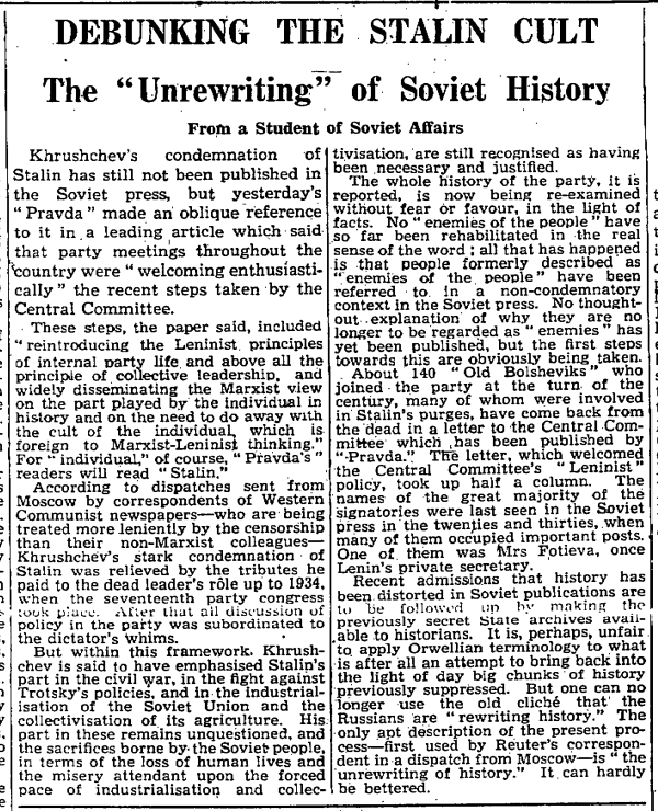 According to dispatches sent from Moscow by correspondents of western communist newspapers – who are being treated more leniently by the censorship than their non-Marxist colleagues – Khrushchev’s stark condemnation of Stalin was relieved by the tributes he paid to the dead leader’s role up to 1934, when the 17th party congress took place. After that all discussion of policy in the party was subordinated to the dictator’s whims.