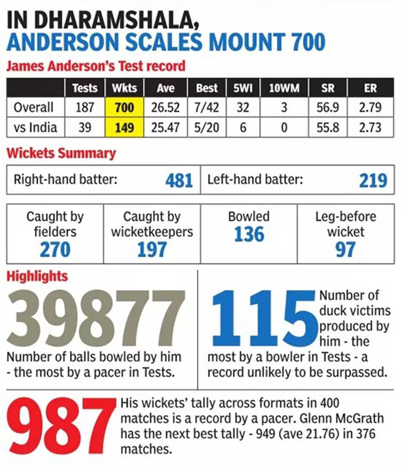 CHENNAI: Australian legend Glenn McGrath hailed James Anderson for achieving a monumental feat, saying that the England veteran has scaled a peak which no other pacer may reach in the future, given the rigours of fast bowling.