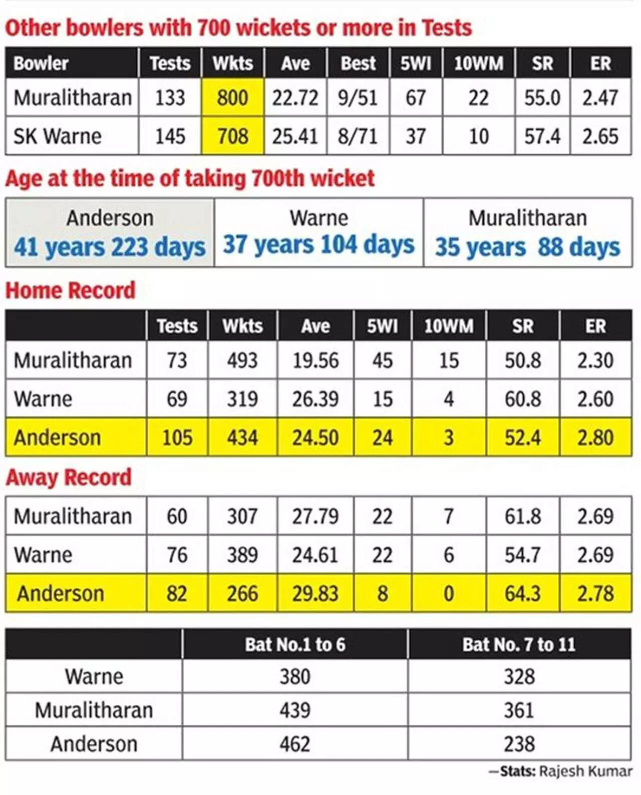 Anderson, ageing like fine wine and still going strong at 41, on Saturday became the first pace bowler to join the elite '700 Test wickets club' that currently has only three members. The right-armer had made his Test debut way back in 2003 and has been playing as a long-format specialist since 2015.
