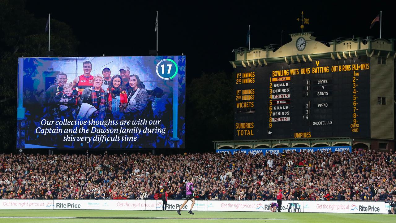 The 45,854-strong crowd at Adelaide Oval stood as one in tribute to Dawson at the 12-minute mark - Dawson's jumper number - in the first quarter against the Saints.