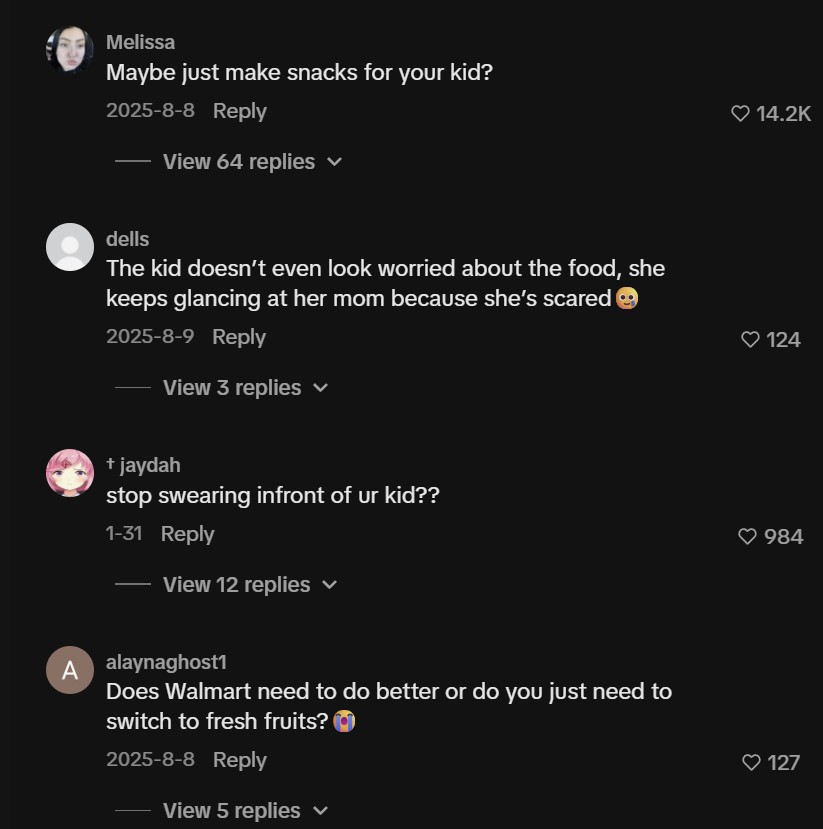 In the post, MacLamroc explains that she opened the snack pack for her daughter during their shopping trip. She immediately expresses her frustration, stating, “I just came into Walmart, and I opened this up for Scarlett to eat, and it literally has f—ing mold on it. I haven’t even purchased this yet, checked out, or left the f—ing store, and it already has mold on it. I just noticed that these apples are absolutely f—ing disgusting looking, too.”