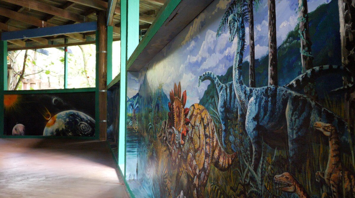 Multiple murals about evolution cover the walls on one of the levels of the circular Rainbow Temple. (ABC north Coast: Leah White)