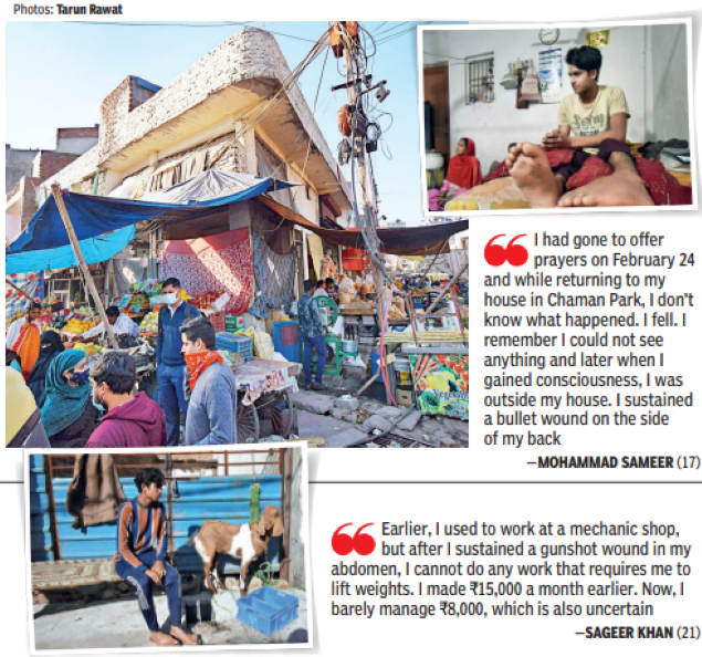 Life hasn’t been easy either for Sageer Khan, 21, who too survived a bullet injury. Having lost his parents at a young age, he lives with his uncle and aunt. He has a younger sister who got married early. Khan told TOI, “I used to work at a car repair shop, but after the gunshot wound in my abdomen, I can’t do work that requires me to lift weights. I was then earning Rs 15,000 a month and now I barely manage to find work. My income is uncertain these days. I have a younger brother to look after. My life took a U-turn due to the riots,” Khan said in a defeated tone.