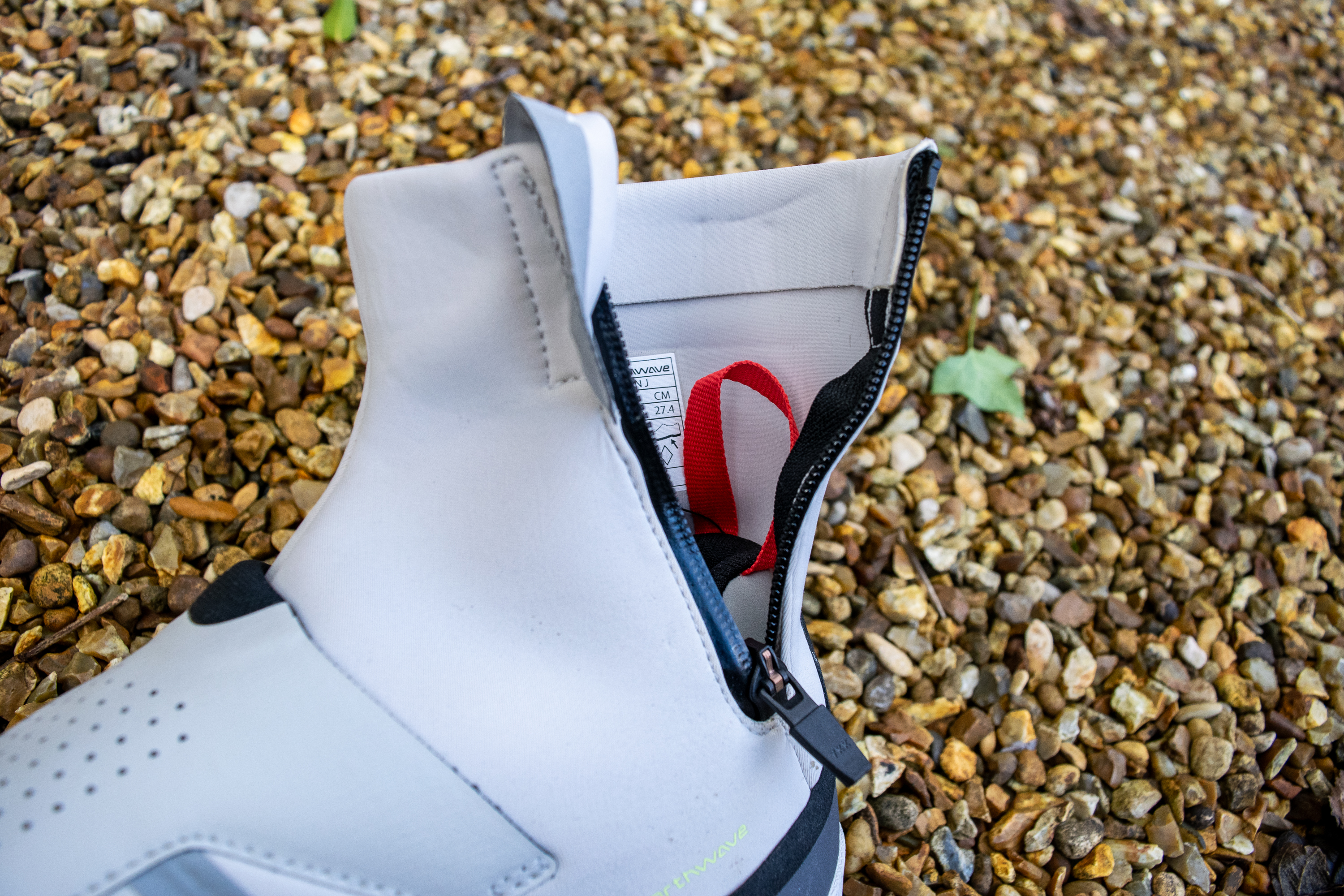 The ankle of the shoe, sometimes a key culprit when it comes to that bulky feeling is made from neoprene. The shoe is pulled on with two red internal pull straps and a sealed side zipper, which then then closes the ankle gaiter up. There's a flap cover over the top of the zip, but it sits a little proud. I'd like it to sit a bit flusher into the ankle, but it's down to the neoprene material, I think.