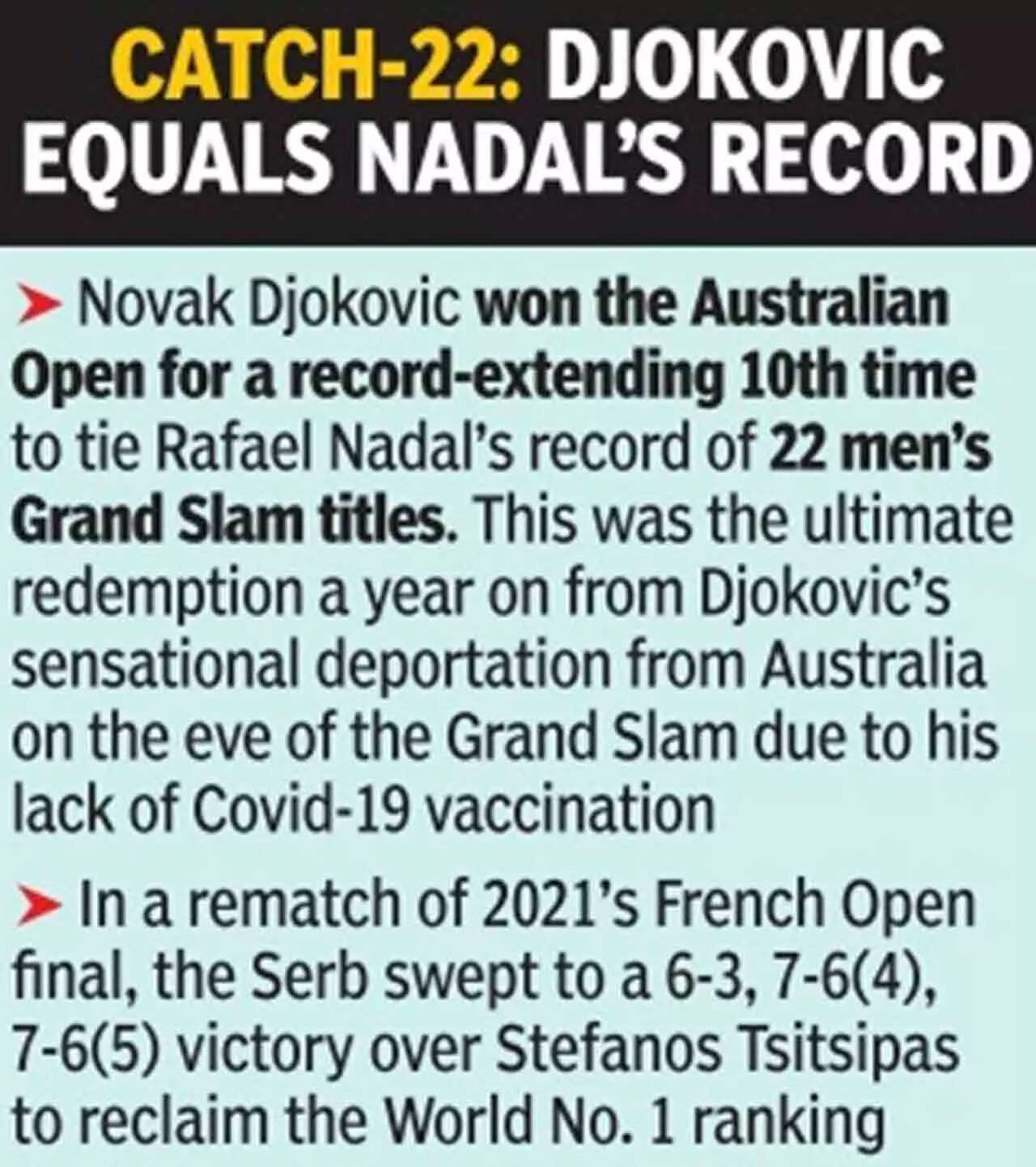 1/10:Djokovic wins Australian Open to equal Nadal's 22 Grand Slam titles