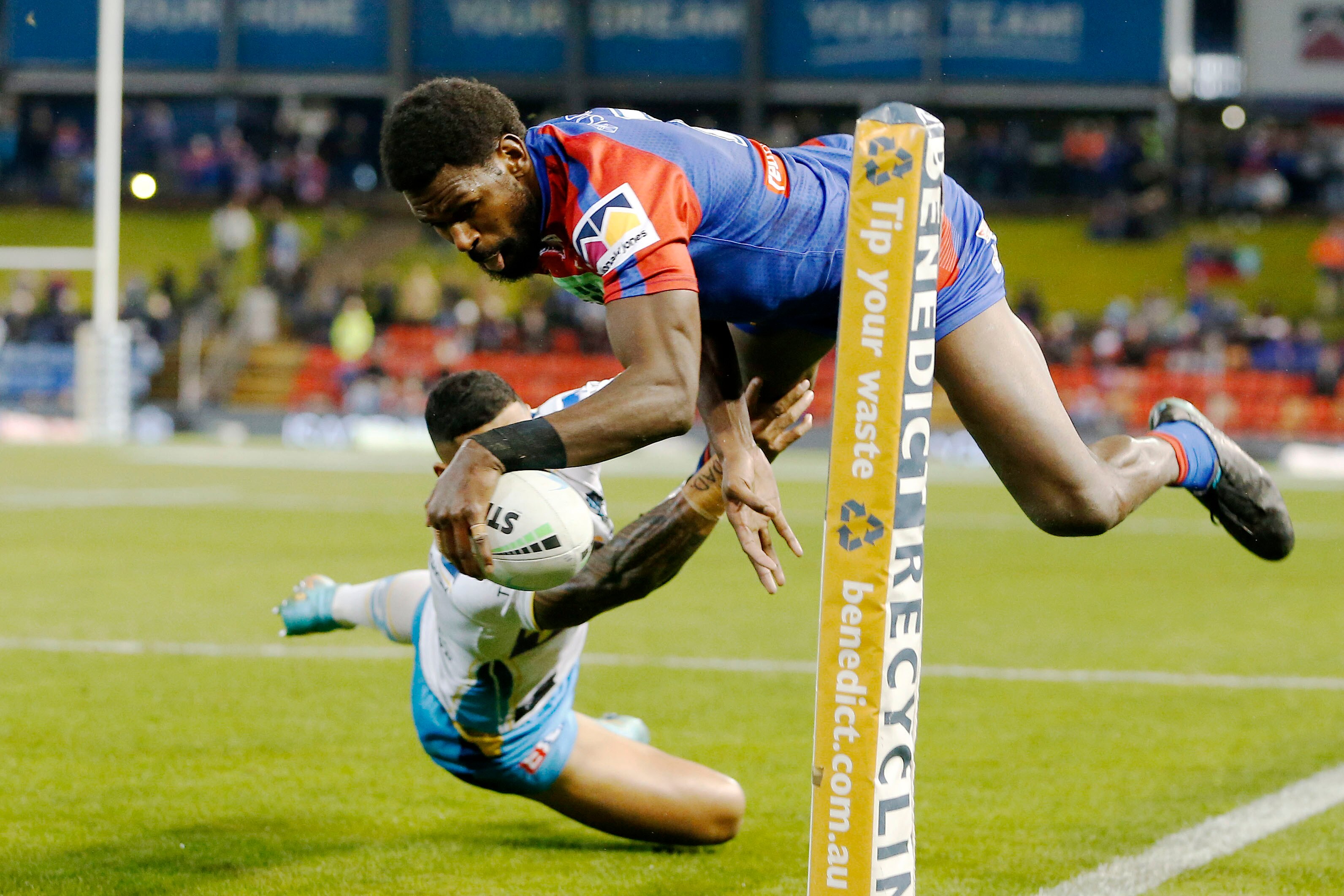 In the second half, Titans prop Jarrod Wallace was sent off for a dangerous tackle on Knights utility Simi Sasagi close to the Gold Coast line.